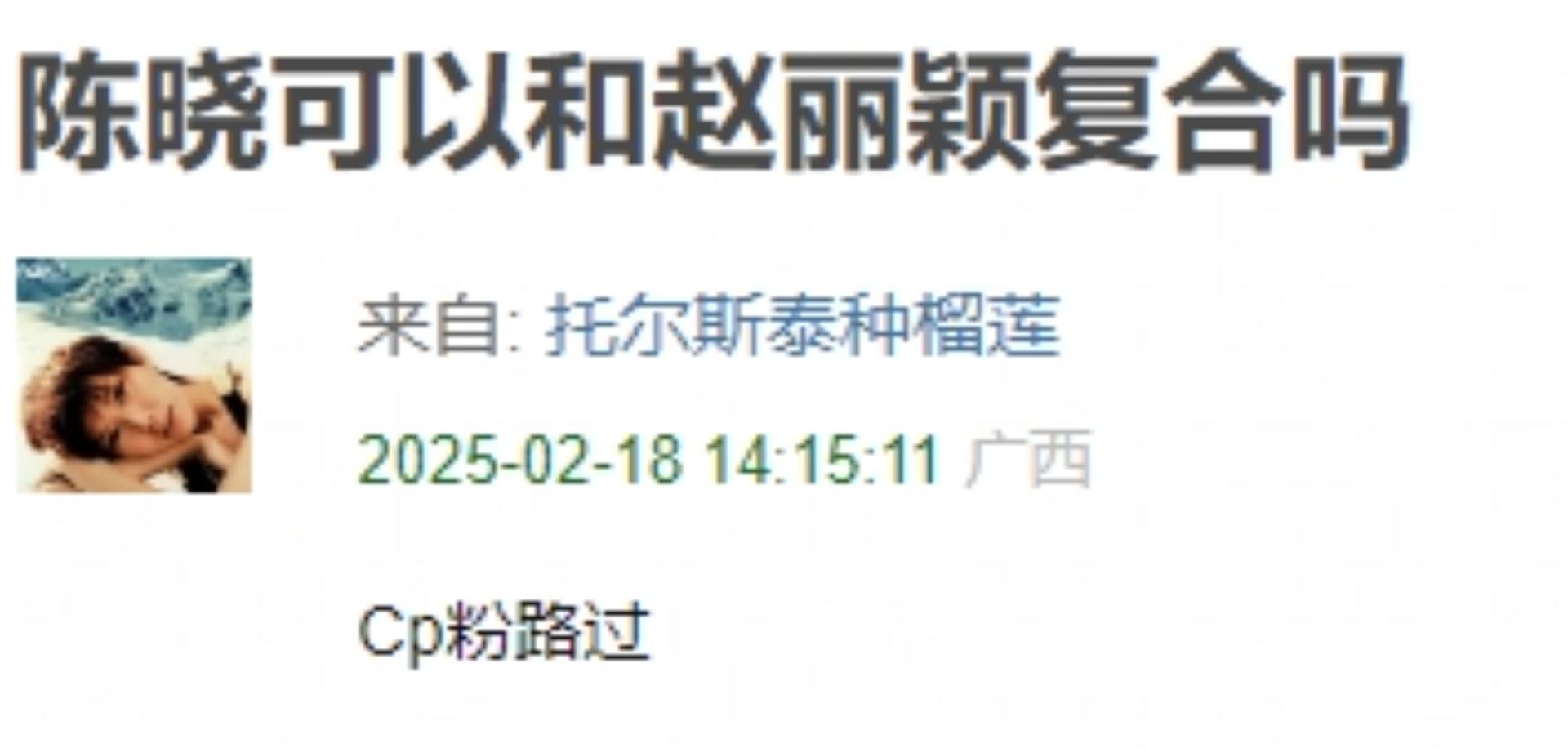 对于网友的猜测,当时于正并没有给出明确的答复。不过在陈晓离婚之后,关于“陈晓可以和赵丽颖复合吗”的话题,瞬间冲上了热搜。