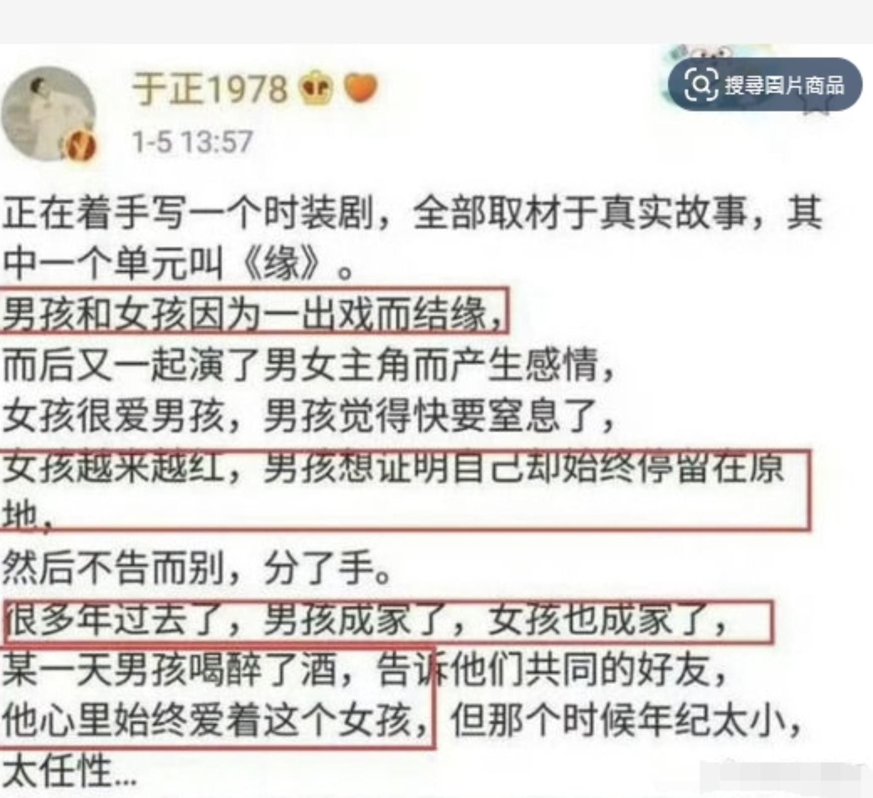 在陈晓和陈妍希官宣离婚之后没多久,就有网友扒出了于正早先的微博,里面一段关于单元剧《缘》的内容描述,让大家纷纷看到了陈晓和赵丽颖的影子。