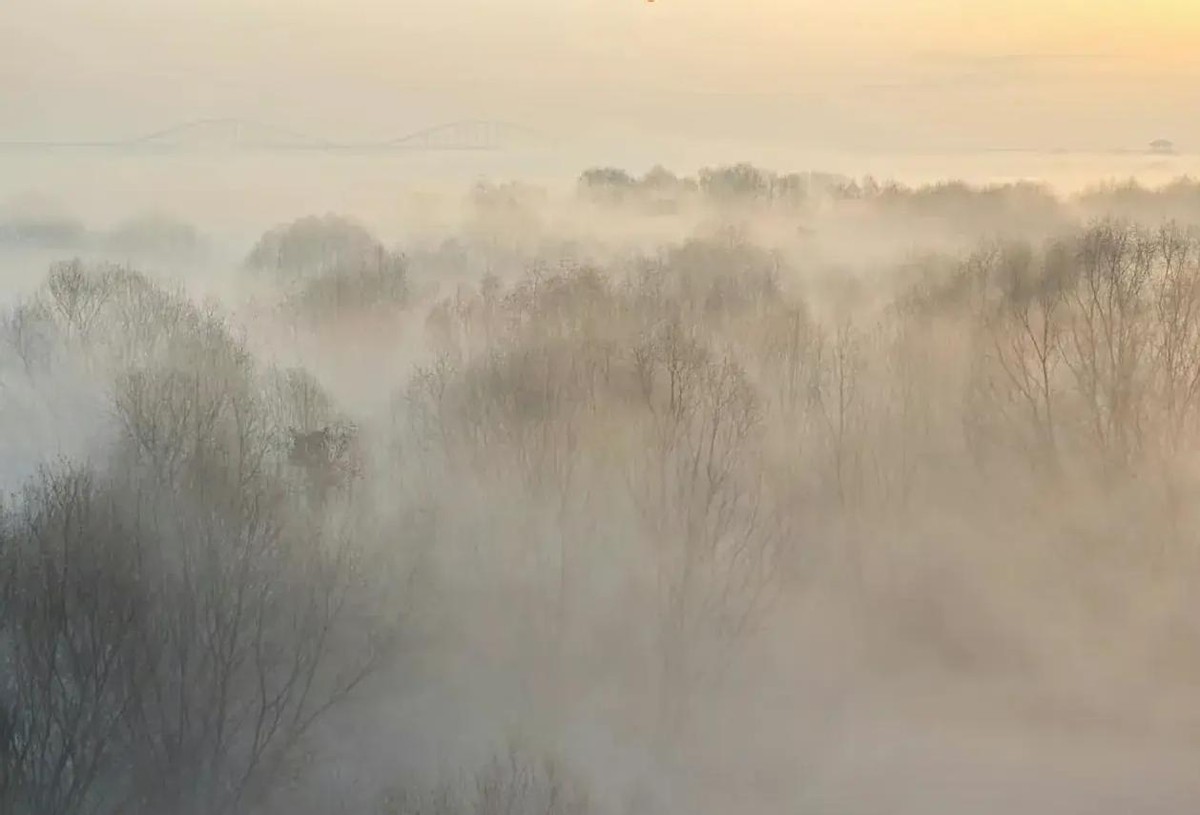 这次沙尘天气下的照片也着实美不胜收,有人惊呼:沙尘暴下的西安古城别有一番韵味。就在2月18日,沙尘暴给秦始皇陵和丽园附近创造了一幅黄土色调的景观,非常适配。照片中行人仿佛化身为兵马俑一般。而渭河流域也被烟尘笼罩,宛如一幅绮丽而美妙的画卷。