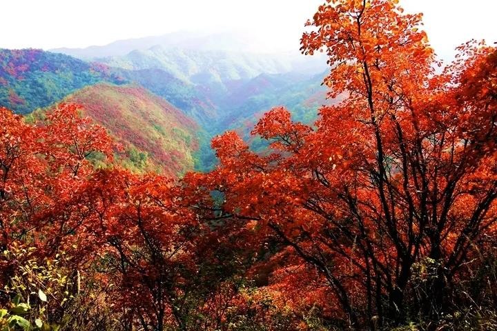 每年霜降过后,三门峡市陕州区甘山国家森林公园万亩红叶,层林尽染,似漫天红霞。一山、一石都披上了瑰奇绚丽的光泽,呈现出或红或绿,或黄或橙的美丽色彩。