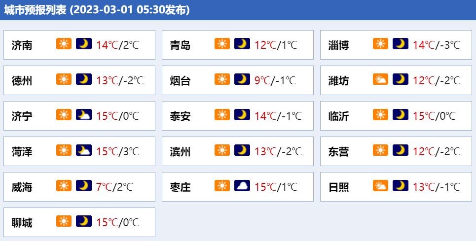 最低气温:临沂、日照、鲁中山区和半岛地区2℃左右,其他地区5℃左右。