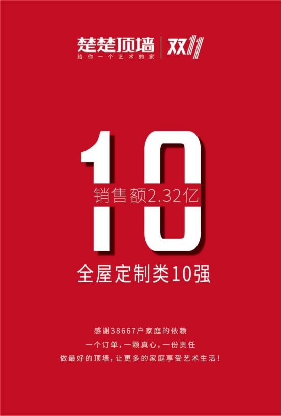 楚楚作为顶墙行业开创者,在双十一交出了完美答卷,顶墙、吊顶双第一名!全屋定制第六名!