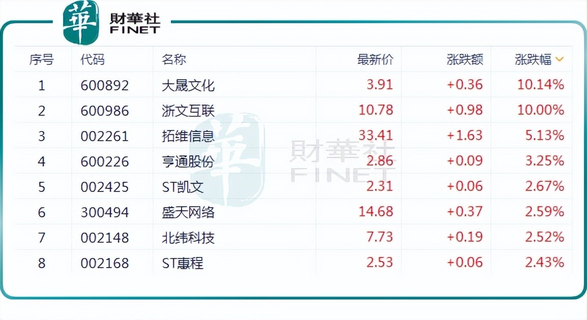 板块内,截至发稿前,大晟文化(600892.SH)录得一字板涨停;ST凯文(002425.SZ)涨2.67%,盛天网络(300494.SZ)涨2.59%,冰川网络(300533.SZ)、电魂网络(603258.SH)等多只概念股出现异动,录得不同涨幅。