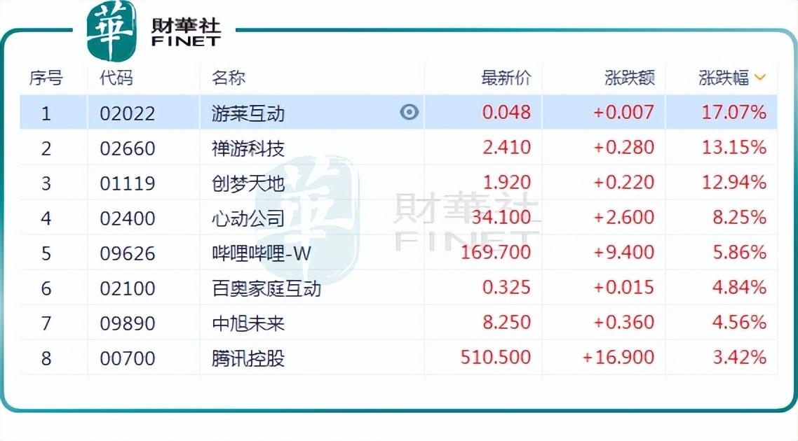 港股方面,多家游戏股亦表现活跃。截至发稿前,游莱互动(02022.HK)大涨17.07%,禅游科技(02660.HK)涨13.15%,创梦天地(01119.HK)涨12.94%,心动公司(02400.HK)涨8.25%,哔哩哔哩-W(09626.HK)涨5.86%,中旭未来(09890.HK)、腾讯控股(00700.HK)、网易-S(09999.HK)、网龙(00777.HK)等在内的多家概念股飘红。