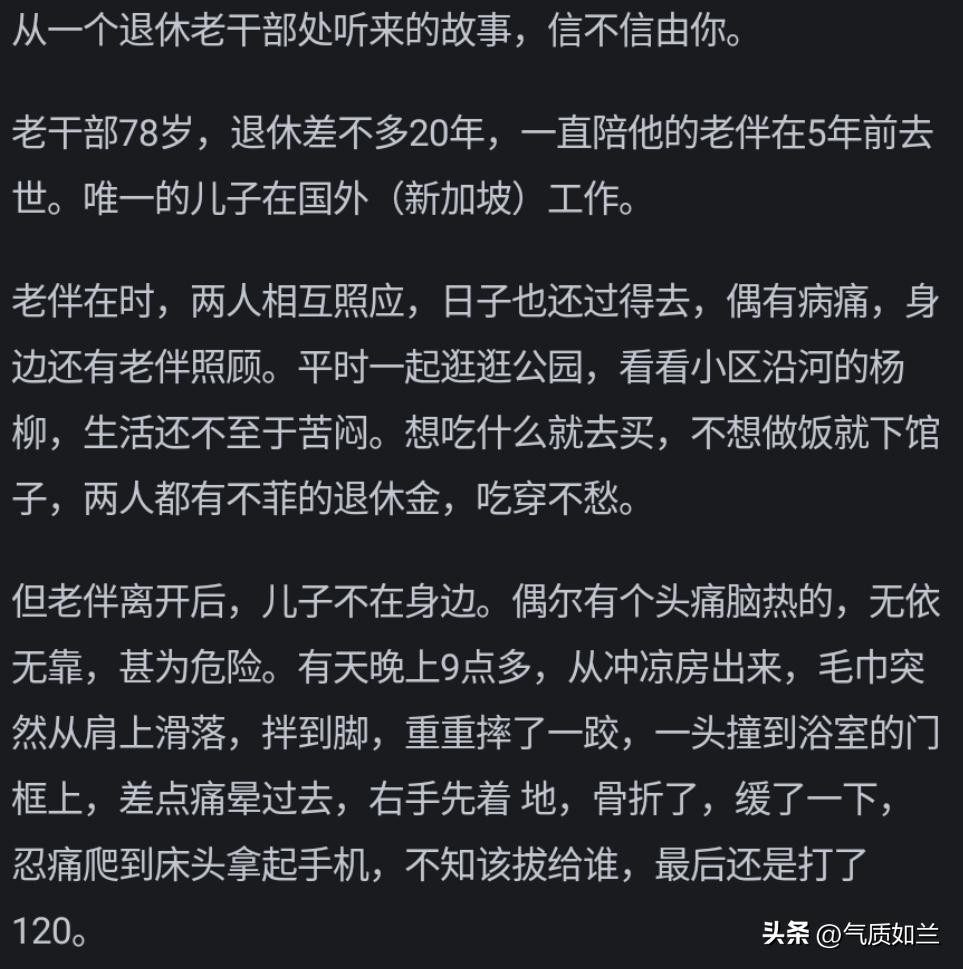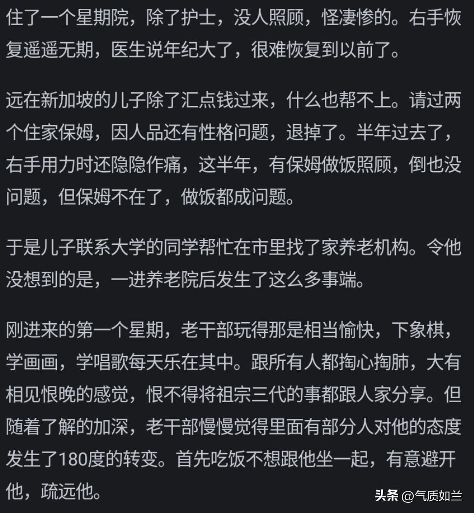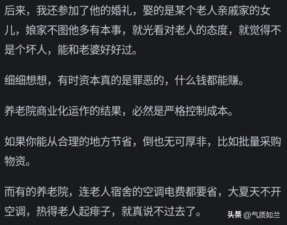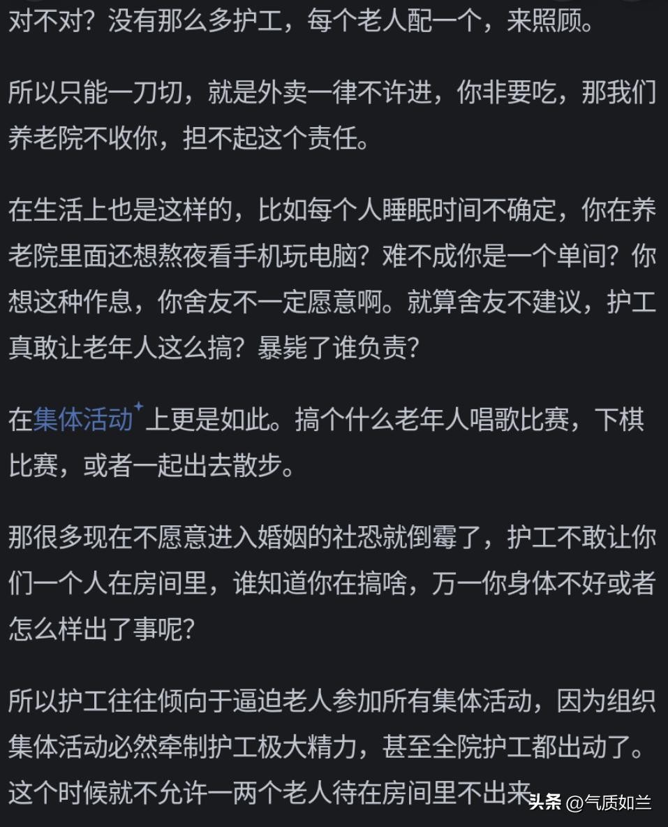 都已经送来养老院了,无非是家里没人,钱又不多,这种家庭只要能照顾到老人无大病痛无大意外,解决吃喝拉撒就万幸了,奢求不起心灵的陪伴贴心的陪护的