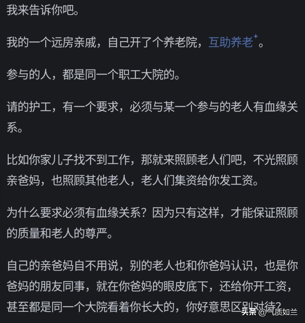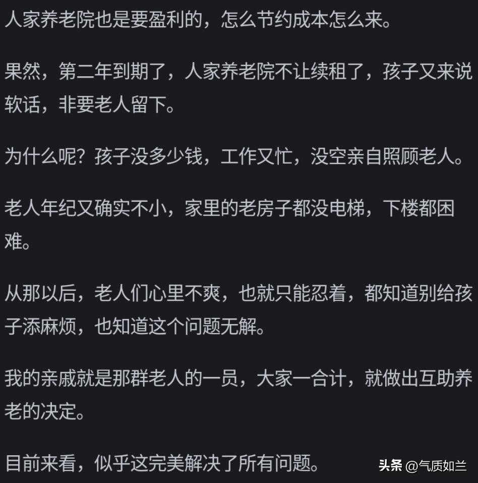 这是见过最靠谱的方案,大院式养老。毕竟宗族无了,而且宗族问题太多。但是依然需要很多晚辈才够人选