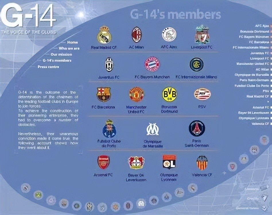 G14联盟成立后影响力越来越大,欧足联让出的利益愈来愈多,欧足联可谓是如坐针毡,一方面又离不开他们一方面又害怕他们出去单干,绞尽脑汁的想去瓦解G14联盟。