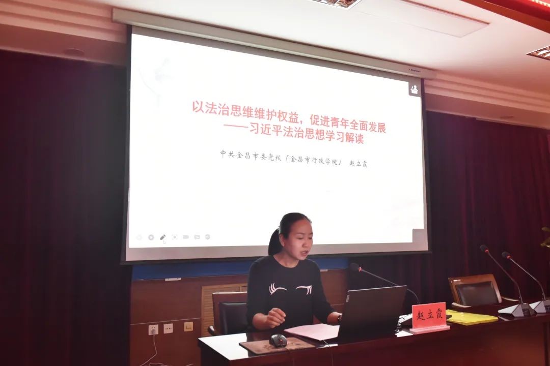 市委党校讲师、市委宣讲团成员赵立霞作了题为《以法治思维维护权益,促进青年全面发展——习近平法治思想学习解读》的专题辅导。