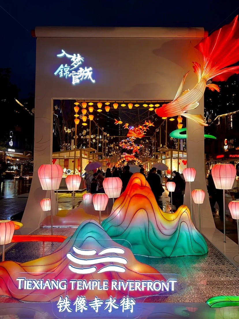 铁像寺水街灯会。千盏灯亮,拉开了水街“入梦锦官城——来水街、过成都年”新春活动的序幕。以“入梦锦官城”为主题,选取水街求贤牌坊、中轴线/通锦桥、龙堤池、喷泉广场、千秋池这五大景点,打造了“千灯展卷”“浮空之鳞”“大梦星河”“福运长明”“云境生波”五大主题赏灯区,且还有超3米巨型非遗鱼灯梦幻巡游,邀市民游客一起穿越千年锦官城,入梦古今巴蜀郡。