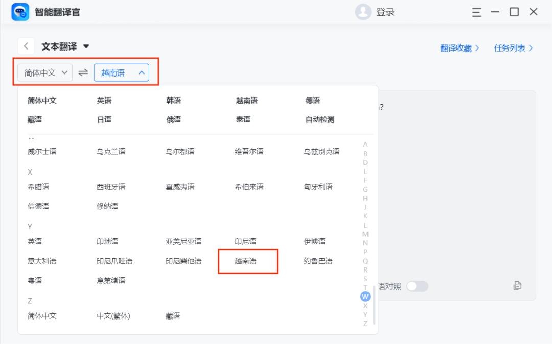 默认的翻译语言是英语到中文的翻译,我们需要将英文调整为越南语,点击语言进行调整,下拉之后找到越南语的选项并点击选择即可,如果需要翻译其他国家语言,在这里面都可以找到。