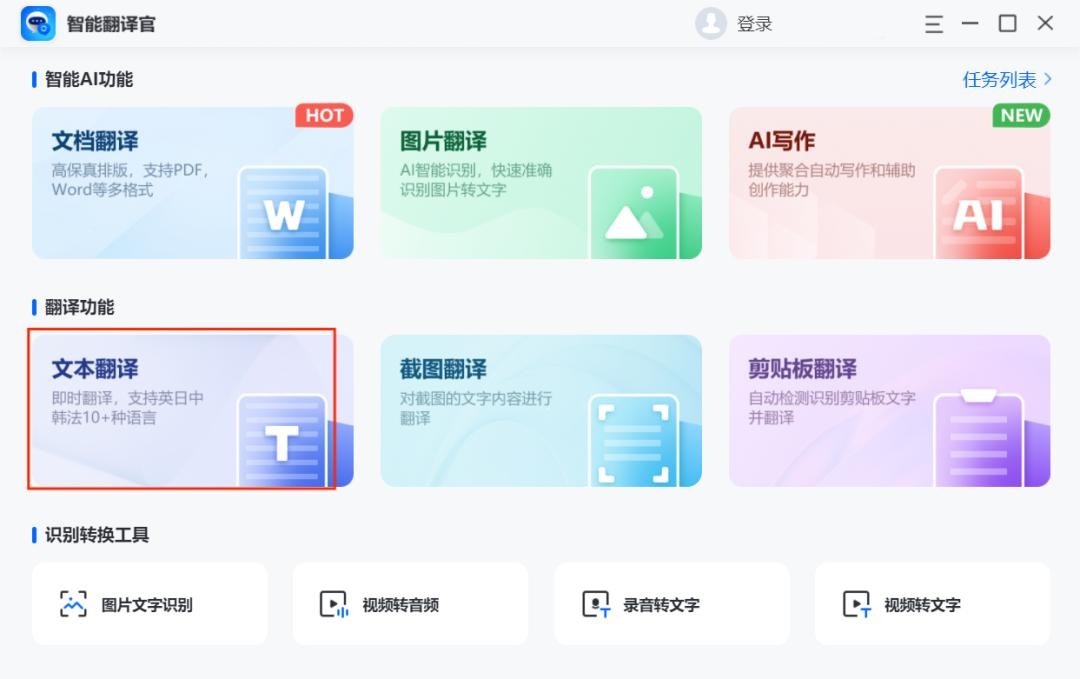 在首页中,我们可以看到多种多样的翻译功能,我们首先选择第二行中的“文本翻译”,可以自己输入或者复制文本内容进行翻译。