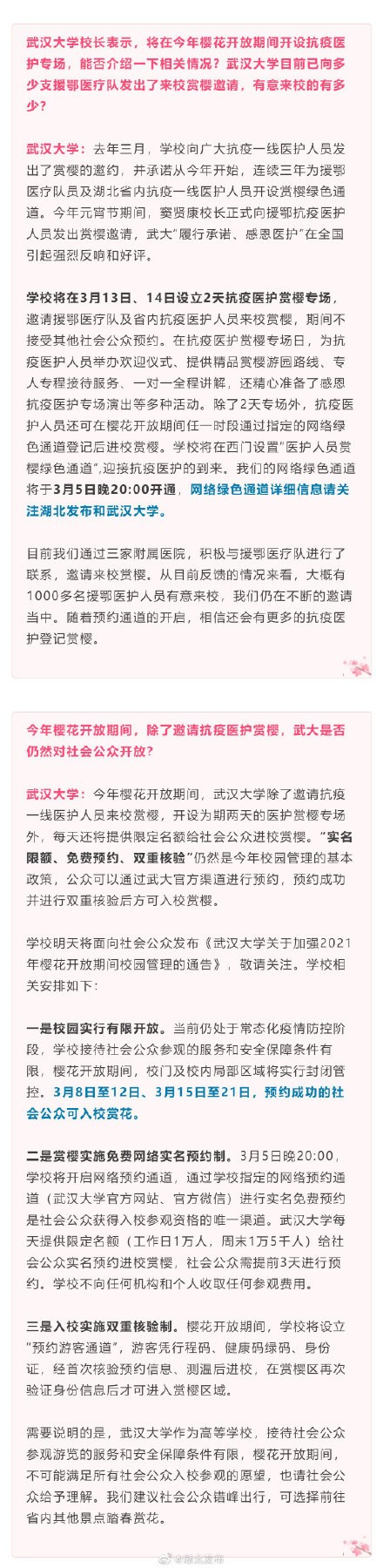 樱约而至相聚荆楚【今年武大赏樱如何预约?官方消息来了!】今年的武大樱花牵动着无数人的心最令人关注的问题就是,公众今年能否预约武大赏樱?到武大看樱花该怎么约?答案来了! 武汉大学明天将召开新闻发布会,详细介绍赏樱政策、预约登记、医护专场,等相关事宜、最新权威消息,敬请关注湖北发布。“女士们、先生们,WH2021樱花号航班即将起飞,目的地:英雄之城武汉,武汉地面风和日丽、草长莺飞,请尽快登机,祝您旅途愉快!”湖北向全国人民发出盛情邀请江河湖北