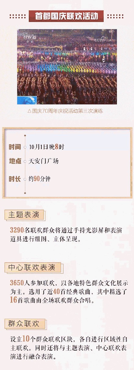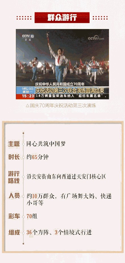 10月1日上午,长安街上、天安门前将化作欢乐的海洋:10万群众、70组彩车组成36个方阵、3个情境式行进,沿长安街由东向西载歌载舞进行群众游行。