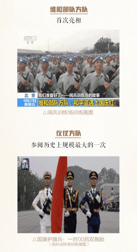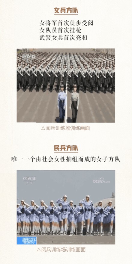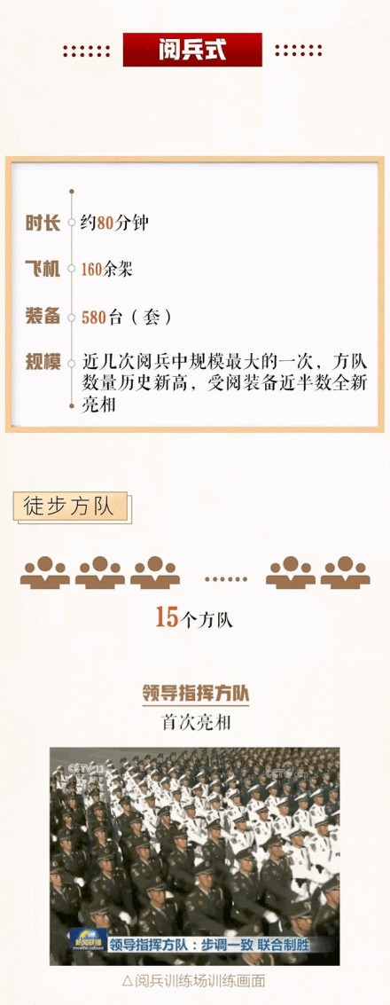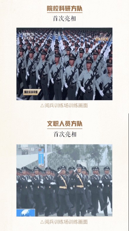 徒步方队编仪仗方队、各军种方队、女兵方队、院校科研方队、文职人员方队、预备役部队方队、民兵方队、维和部队方队等15个方队。