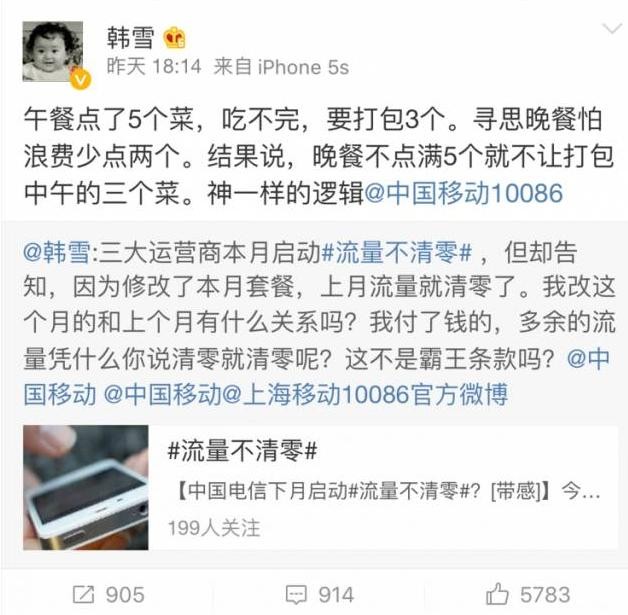 去年11月,韩雪的发一条微博,中国移动都得出来解释!!!