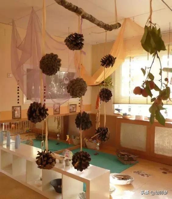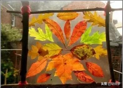 将树叶随意的贴在透明塑料纸上,或者吊在树枝上装饰玻璃窗。幼儿园的窗户马上变身成美丽的树叶展览窗,增添了几分艺术气息哦!和孩子们一起动手吧!