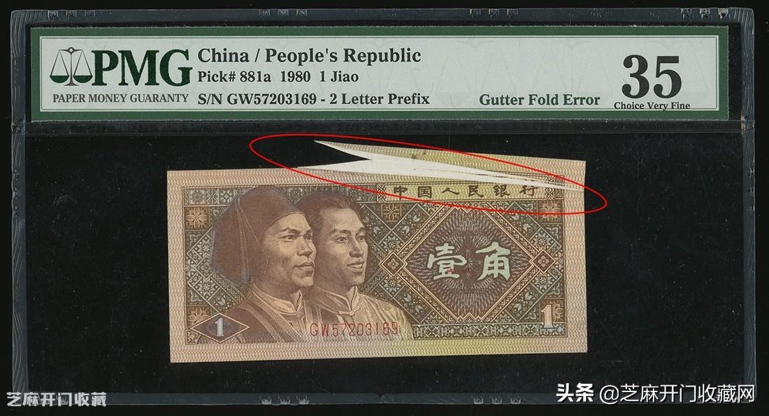 3:中国人民银行第四版人民币一角,1980年,裁切福耳错体,PMG鑑定,评35,罕见,成交价格: HKD 3600