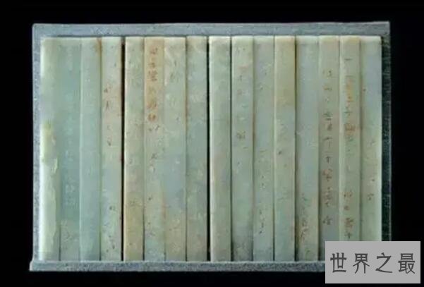 这个长29.8厘米,款2厘米,目前收藏在台北故宫博物院中的十六简玉册,是利用青白色的玉石制作,每个简之间用金线进行串联制作的玉册,而这个楷体的册文,上面书写的字根据残存的笔划推测,大概是宋太祖、太宗的谥号。