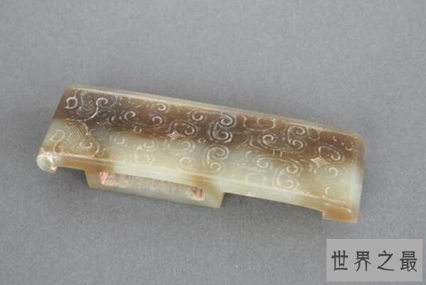 这个由宽2.3厘米,长7.3厘米的上部分,宽2.5厘米,长8.8厘米的下部分共同组成的玉器,目前被收藏在杭州历史博物馆中,而在这个于青色的玉质上用随意的线条雕刻着蒲纹、侧面阴刻着卷草纹,是仿汉式宋代玉器。
