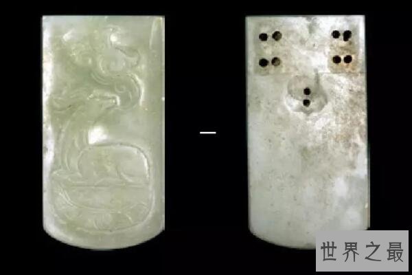 这个利用通体莹白,局部分布有红褐色晕斑的白玉制作的玉器,是从四川广汉市和兴乡联合村出土的南宋时代玉器,是在器物的正面利用镂雕和圆雕技法雕琢出一只身体盘曲的大螭,和一只体态温顺的小螭。