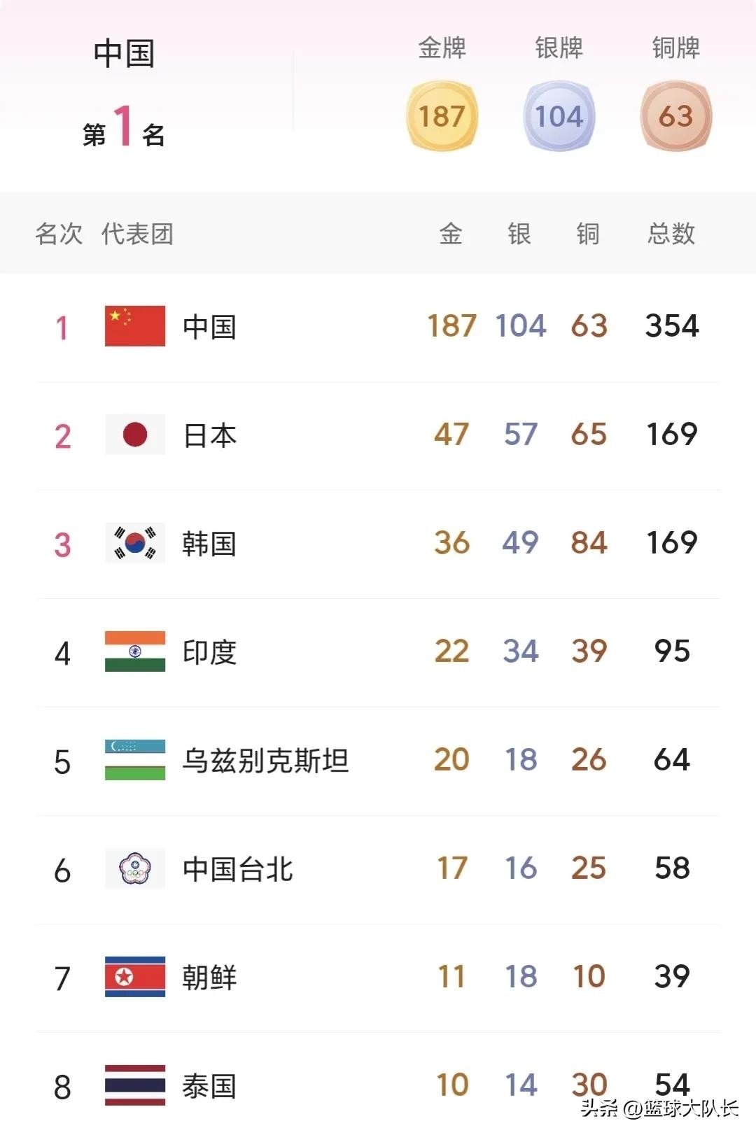 亚运会最新奖牌榜:中国轰354居第1,日韩并列第2,印哈分居4、5