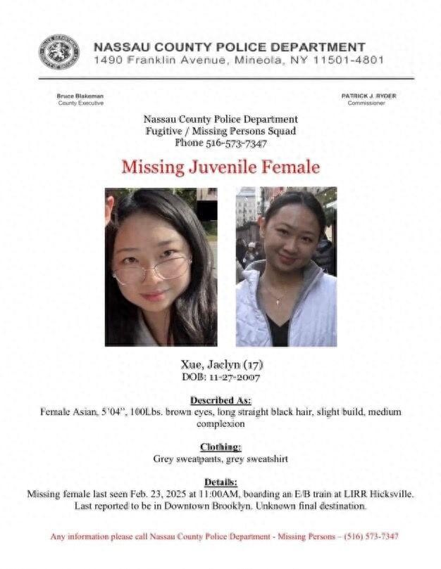 当地时间2月25日晚,美国纽约的约翰·肯尼迪高中发布通告,证实该校17岁华人女生薛嘉琳(Jaclyn Xue,音译)已离世。此前两天,当地警方曾发布寻人启事寻找她。