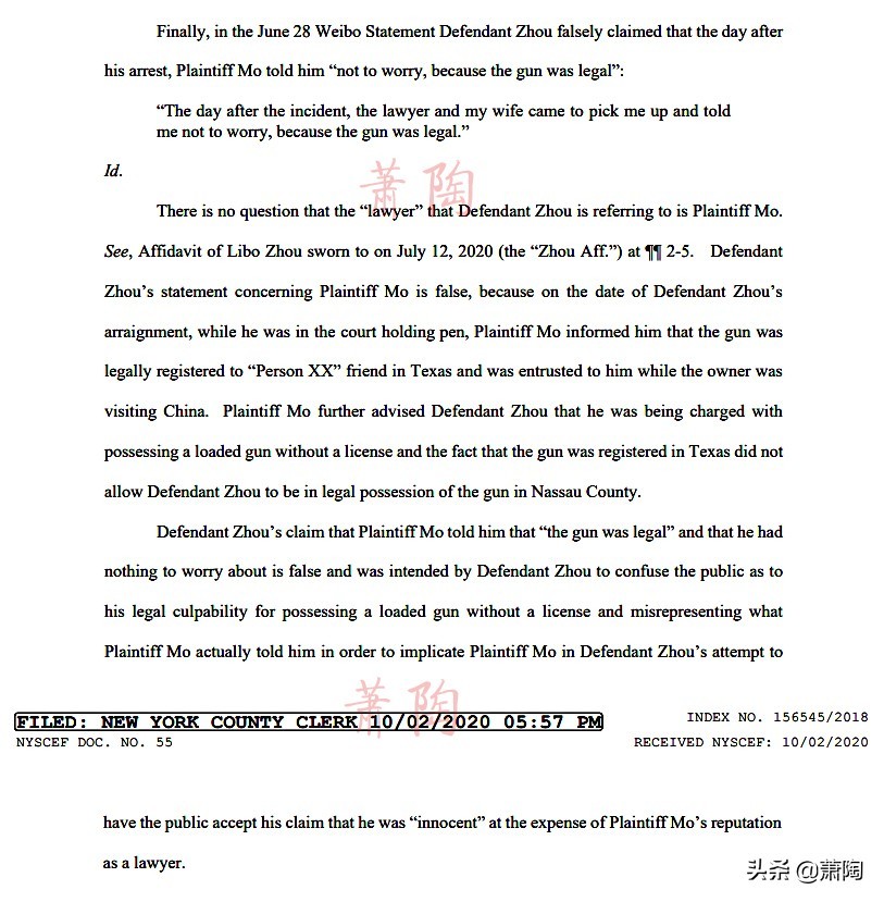 此外,莫虎强调他的起诉完全符合法律对起诉诽谤罪的要求。他还要求法官准许他对诉状进行适当的修改。他提到周立波在纽约卡内基的演出。虽然没有明说,但从语境上看莫虎指的应该是去年的演出。这里萧陶多说一句。在去年的演出中,周立波对观众说,你们要是碰到波波前律师,让你家破人亡,你家里的information登上《世界日报》。