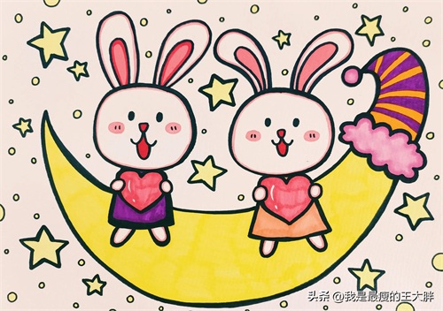 第六步:画出大大的月亮,月亮戴了帽子,周围画上星星。