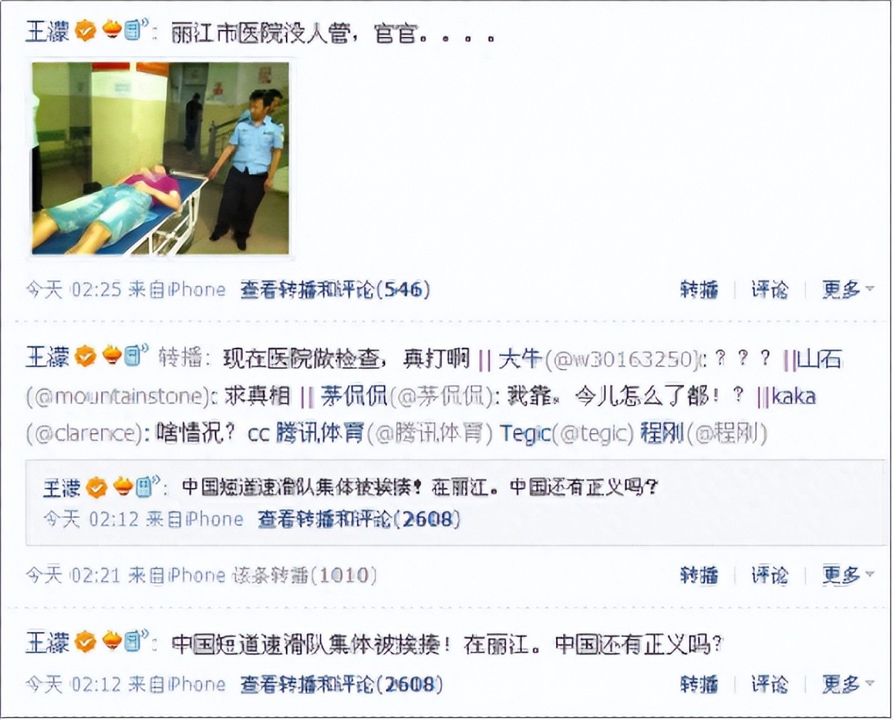 就在2011年,中国短道速滑队在丽江与当地巡防队发生肢体冲突,暴脾气的王濛一连发几条微博痛斥丽江。