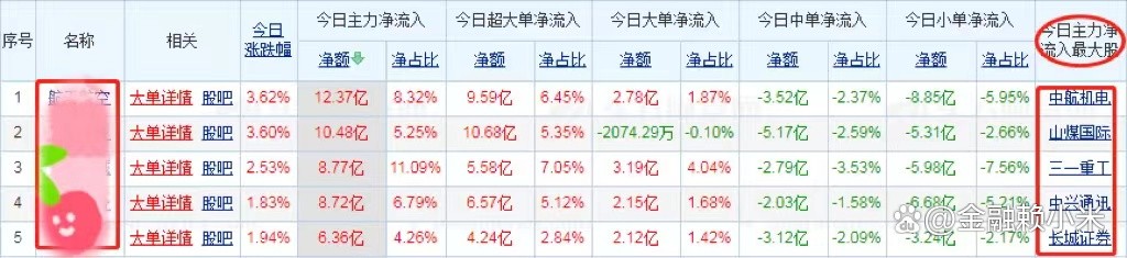 第二步:从前五名板块中找出主力资金净流入最大的股票。