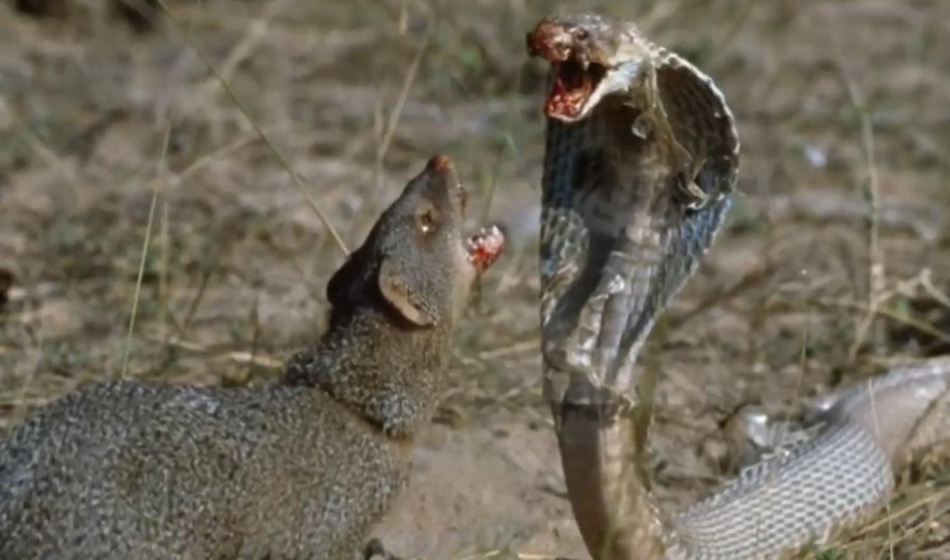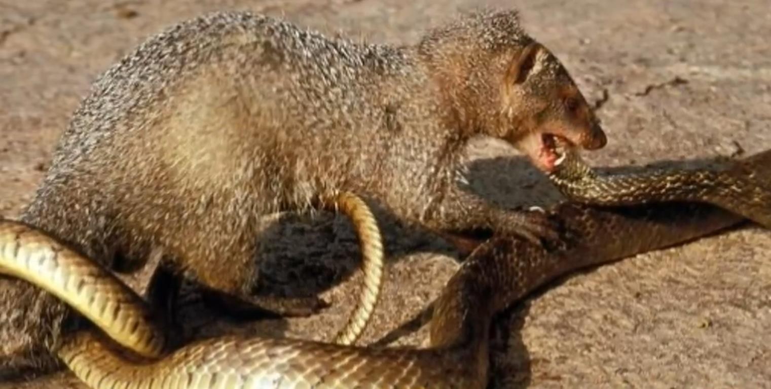 蛇獴看起来是一种浓浓的小动物加上尾巴长度也不过只有70多厘米但是他们却是天生的捕蛇能手。就像猫天生会捉老鼠样。蛇獴天生也都会捉蛇而且蛇獴对毒蛇好像有一股天生的恨意即便吃饱了肚子,见到毒蛇也还是会痛下杀手。此外除了自己天生就具备的捕蛇技巧之外蛇獴体内也有着神奇的抗毒能力即便是眼镜王蛇的毒液也奈何不了它,如果一对一的情况下眼镜王蛇还是有机会全身而退的但是如果超过两只蛇獴哪怕是母蛇獴带了一只小蛇獴眼镜王蛇也绝对难逃毒手。