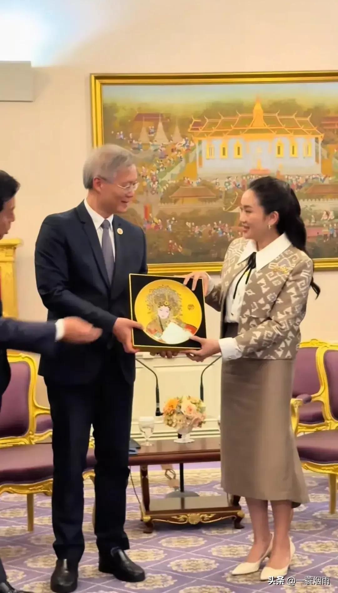 然而,高潮出现在会谈结束之际。商会会长递上一份特别的礼物——一幅佩通坦的古装头像,头戴凤冠,背景金黄,圆形图案嵌于正方形盒中,颇具中国传统绘画韵味。这份礼物不仅让佩通坦眼前一亮,更让在场的每个人都感受到了中泰友谊的深厚。