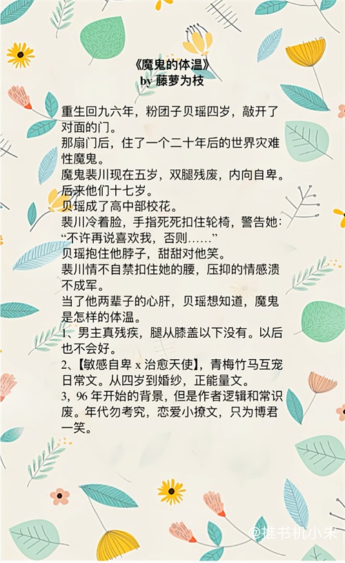短评:这本是救赎文,很好看。男主真的好惨呜呜,被父母的仇家报复没了双腿。因为前世男主帮了她,女主就在重生回来的告诉小时候的自己一定要对男主好(因为到后面记忆会慢慢模糊),然后他们一起长大,就男主很自卑很别扭认为自己配不上女主,觉得和女主在一起别人会嘲笑她,看到男主纠结真的心好疼,他一次次解剖自己的心,还好女主从来没有退缩。前世的男主也好惨啊呜呜,幸好在番外里有19岁的女主去陪着他。
