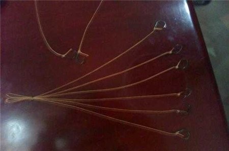 (5)如上反复,一般一组使用六枚钩,做好一组后,把每根绑好钩的线对折,三根一组,打个结,这样就完成了;
