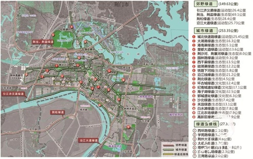 荆州市绿道是以平原水乡城市特质为基底,结合城区大型河湖水系,广场公园以及城市重要景观节点等进行布局。通过绿道网络的构建,将“一城三区”的重要景观资源,如:熊家冢景区、八岭山森林公园、太湖港水利风景区、引江济汉渠、海子湖风景区、白水滩湿地公园、滨江公园以及沿线工业遗产等进行串联,使其更好地发挥作用。围绕“环古城、滨长江、沿河湖”的发展思路,结合“荆州园博会”等重点建设项目,制定绿道三年行动计划。