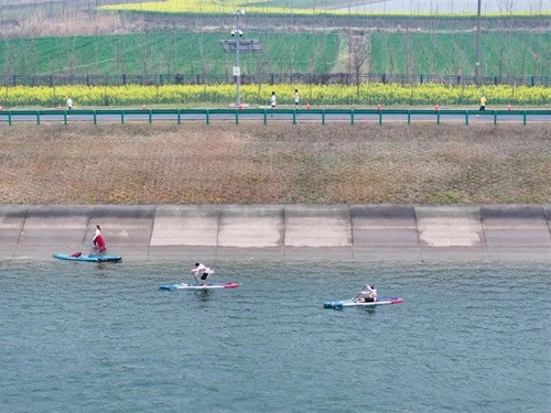 赛道旁,一场热烈的“水上马拉松”——桨板10公里表演赛同步上演,“岸上万马奔腾,江中百舸争流”,尽展沙洋人民“善水”、“乐水”的活力形象和沙洋“魅力水城”的城市名片。