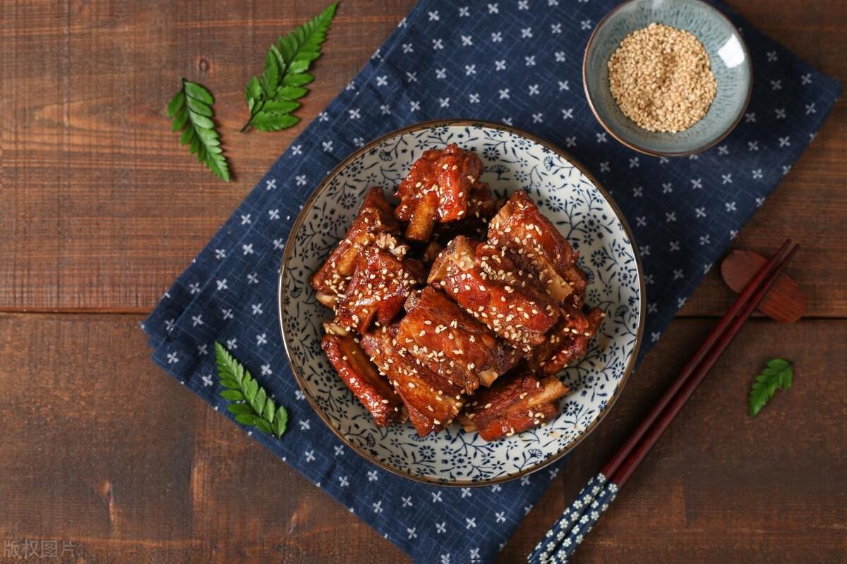 做法:将猪排骨洗净,切成小块,放入沸水中焯水,捞出沥干水分备用。锅中放少许油,放入适量冰糖,小火炒出糖色。放入猪排骨,翻炒均匀,加入姜片、葱段、料酒、生抽、醋、盐,翻炒均匀。加入适量清水,大火烧开后转小火炖煮30分钟左右。大火收汁,撒上熟白芝麻即可。