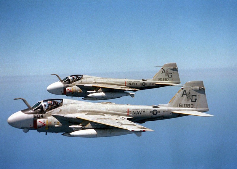 A-6入侵者攻击机自六十年代初开始在小鹰级航母上服役。A-6采用双座、双发设计,装备了先进的全天候电子系统,最大起飞重量为27.39吨,亚音速飞行,时速0.85马赫,具有携带多种对海对陆武器的能力,最大载弹量可达8吨,作战半径达到1200公里。由于A-6性能出色,后来还衍生出了多个型号,包括侦察机、反辐射机和电子战机等。每艘小鹰级航母可搭载包括KA-6D加油机在内的16架A-6攻击机,此外还搭载了4架EA-6B徘徊者电子干扰机。