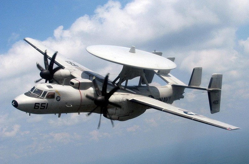 为了增强航母的防空探测能力,美国海军于1964年开始装备E-2鹰眼固定翼预警机,每艘小鹰级航母可搭载4架E-2预警机。E-2鹰眼机载5名机组人员,机身长17.6米,翼展24.56米,折叠后翼展为8.94米,最大起飞重量26吨。E-2预警机配备双涡轮螺旋桨发动机,最大飞行时速846公里,实用升限10576米,续航时间达6小时,被动探测系统包含四组天线,探测范围达480公里。