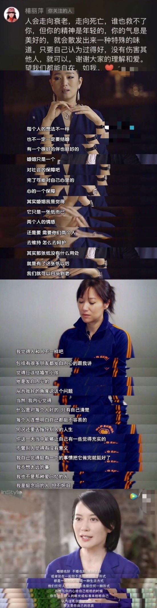 事实上,对于婚姻和生育的选择上,巩俐、俞飞鸿、徐静蕾等圈内成功女性都发表过自己的看法,在这次大讨论中,也再次被翻出来,像俞飞鸿的观点就很让人称赞"我不是不婚主义,也不是单身主义,任何人完全有自由选择任何一种形式"。不需要一味批判与众不同的人,因为尊重别人也是尊重自己。