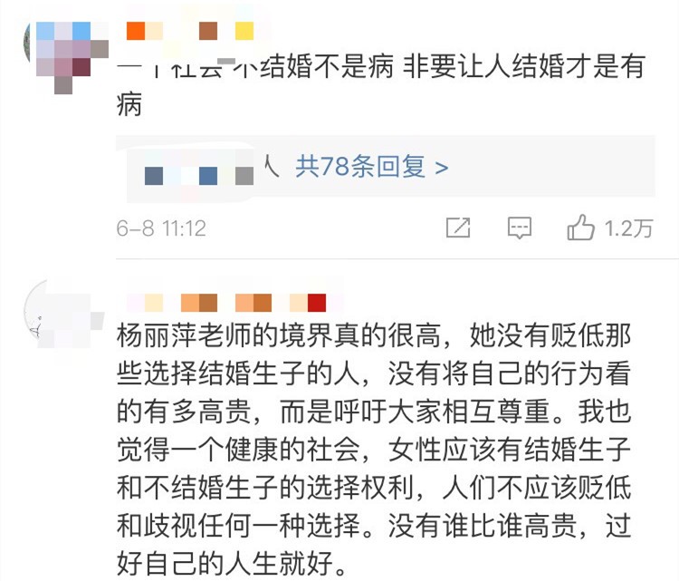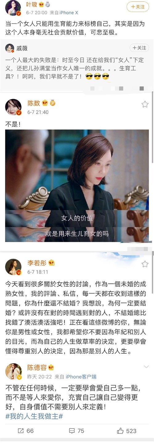 戚薇在微博发文表示:"一个人最大的失败是:时至今日,还在给我们'女人'下定义,还把儿孙满堂当作女人唯一的成就……生育工具?!呵呵,我们早就不是了!"同样未婚未育的李若彤,也感同身受发文表达了自己的观点,"没有在对的时间遇到对的人,不结婚总比找错了凑合凑合要强。要学会懂得尊重别人的决定,因为那是别人的人生。"陈数则贴出了自己曾出演的电视剧截图,图中的台词是:女人的价值用来生儿育女的吗?陈德容也表示,"自身价值不需要別人来定义!"