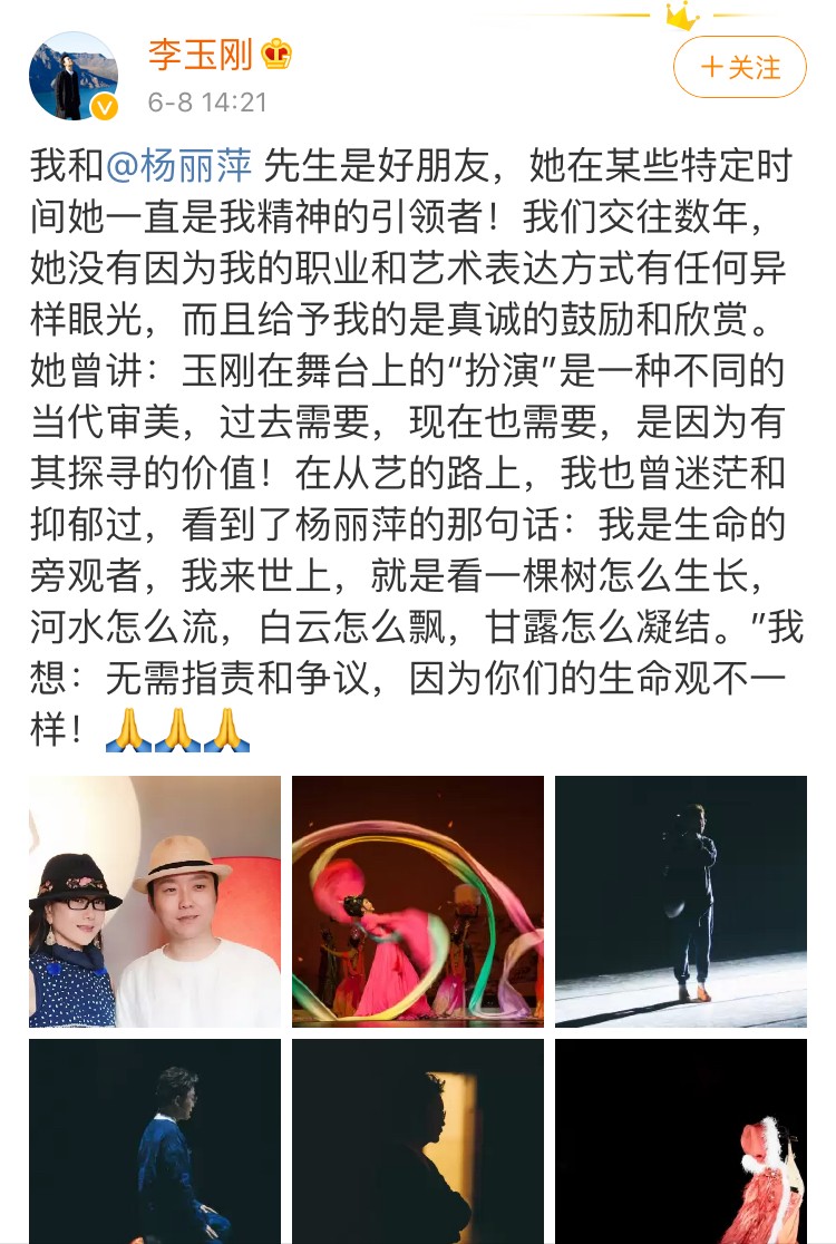 8日,李玉刚也就此事发长文力挺杨丽萍:"我和杨丽萍先生是好朋友,她在某些特定时间她一直是我精神的引领者!我们交往数年,她没有因为我的职业和艺术表达方式有任何异样眼光,而且给予我的是真诚的鼓励和欣赏。她曾讲:玉刚在舞台上的'扮演'是一种不同的当代审美,过去需要,现在也需要,是因为有其探寻的价值!在从艺的路上,我也曾迷茫和抑郁过,看到了杨丽萍的那句话:我是生命的旁观者,我来世上,就是看一棵树怎么生长,河水怎么流,白云怎么飘,甘露怎么凝结。我想:无需指责和争议,因为你们的生命观不一样!"
