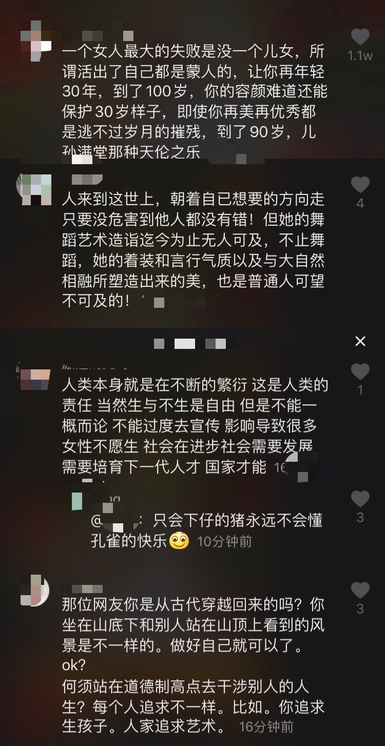 事情要从吃火锅说起。三天前,杨丽萍团队的帐号在社交平台晒出杨丽萍吃火锅的一条视频,视频中杨丽萍身穿白色长裙,皮肤紧致面容姣好,愉快地吃着火锅"谁说吃火锅不能有鲜花相伴",结果这条让人心情愉悦的视频下有人留言"一个女人最大的失败是没一个儿女,所谓活出了自己都是蒙人的""即使你再美再优秀都是逃不过岁月的摧残"……这话瞬间引发了网友反驳"不要随意用自己的价值观和生活态度评论别人",有网友认为,杨丽萍从来没有倡导女生要选择事业,她只是对了自己认为最好的人生,"看评论说没有孩子就是失败,我突然觉得穿越到了八十年前"。
