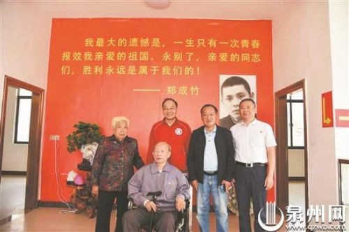 当年E区区委书记、与郑成竹一起被敌包围后脱险的傅维蔡(前排中)到访成竹革命史迹纪念馆。