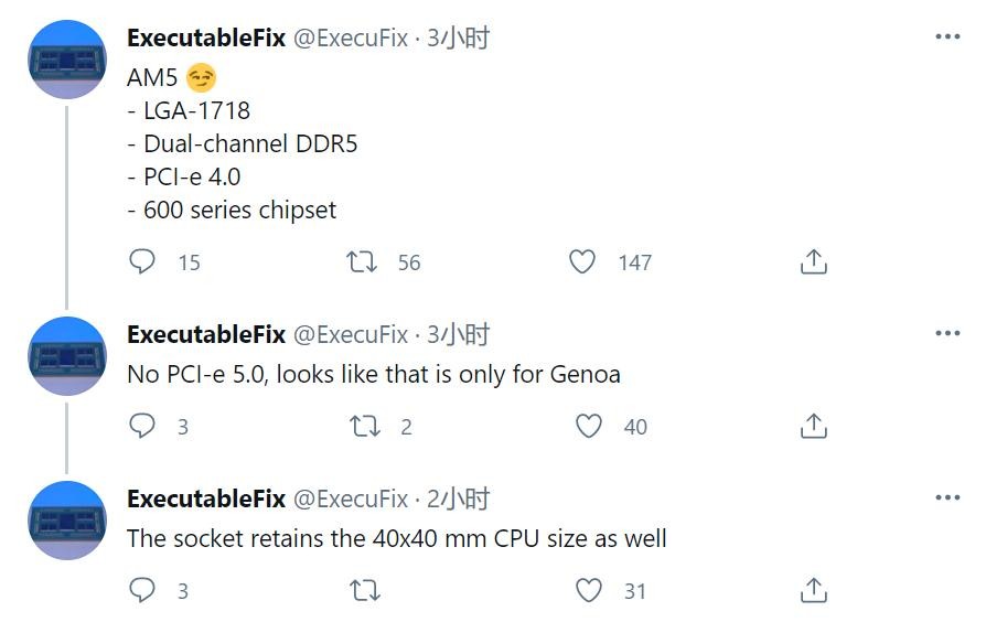 爆料者还透露,AMD 这一代桌面处理器还会支持双通道 DDR5 内存,但是仅仅支持 PCIe 4.0。PCIe 5.0 的支持仅限代号为“Genoa”的 EPYC 霄龙服务器处理器。尽管 CPU 接口更换为 LGA1718,但是 CPU 的大小并没有改变,依旧为 40mm×40mm。
