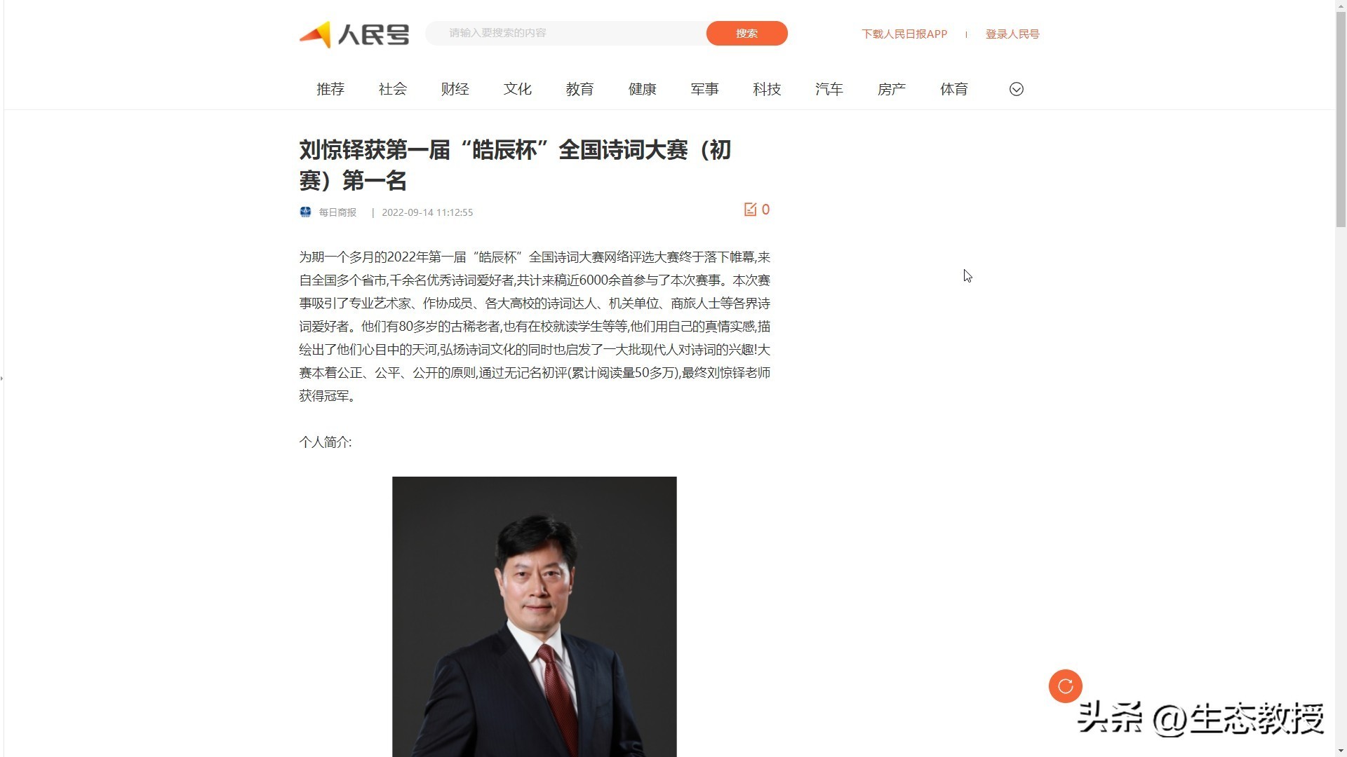 人民日报、人民网、人民号追踪报道:刘惊铎获得第一届全国诗词大赛初赛第一名、决赛冠军