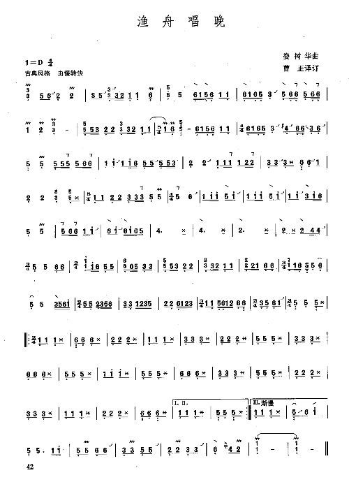 尾声,在高潮突然切住后,结尾的速度放慢,音乐缓缓流出,是喜悦后的平静。其音调是第二乐段一个乐句的紧缩,运用下行音型模进的旋法逐渐引向终止,收束在宫音上,出人意外又耐人寻味。仿佛夜色笼罩了江面,宁静取代了喧闹,直至最后一个水波涟漪也在袅袅余音中消失。此结尾类似的节奏和旋律,又好似和乐曲开头呼应,但这恰恰是乐曲的点睛之笔。渔翁劳累半天看着满仓的鱼获,对照第一网的惨淡,不禁悠然一笑,发出感叹:世事无常,失之坦然,得之淡然,人生在世,总是有得有失,不必计较!