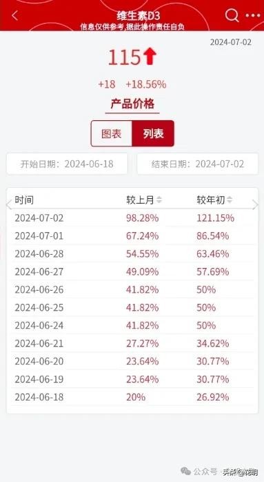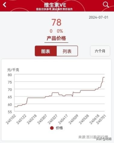 截至7月2日,维生素最新价格:VE:78元/kg(年初59元/kg) VD3:115元/kg(年初56元/kg) VA:87元/kg(年初72元/kg) VB1:182元/kg(去年9月115元) VK3:95元/kg(去年11月58元/kg)