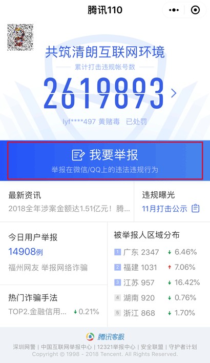 2. 通过小程序举报:搜索“腾讯110”小程序->我要举报->选择类别->填写举报内容->点击“提交”即可。