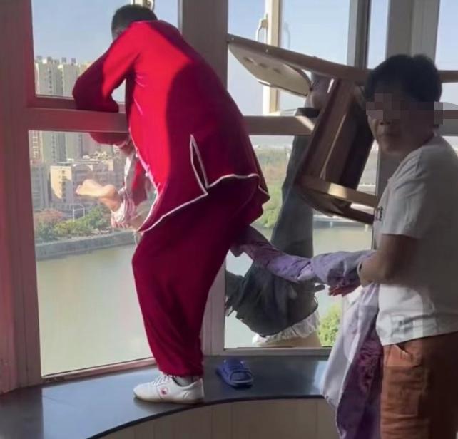 其实,杨女士心中对于老人家是否上锁并没有底,她原本想和男子把门踹开,但好在老人家中并没有锁门。推开门,三人看到老人整个身体倒挂在 14 楼窗外,仅一只脚卡在室内的凳子靠背里,而椅子的靠背和椅腿正好卡在了窗户上,才让老人没有掉下去。